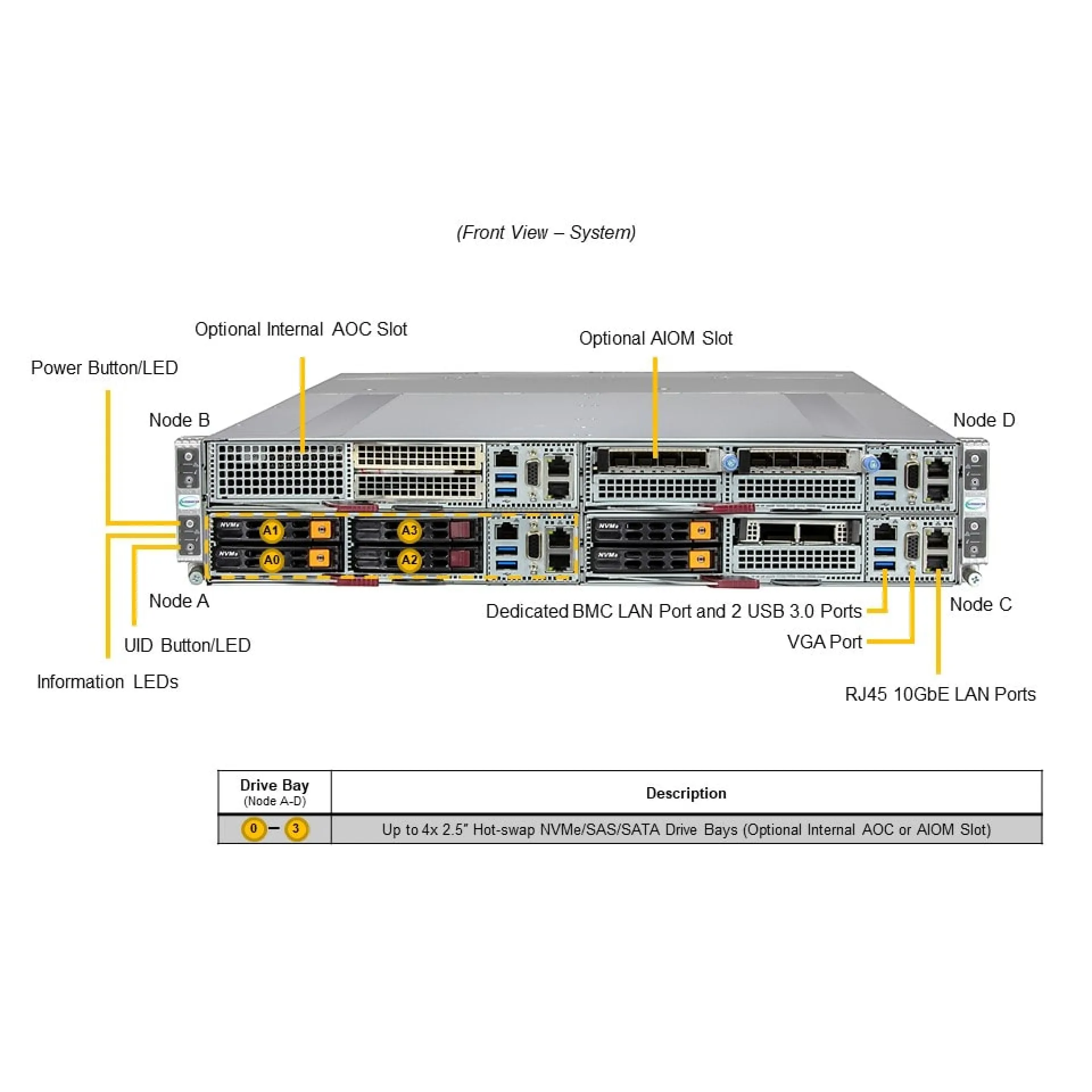 | Sürücü Yuvaları | 4x 2.5" SATA/NVMe/SAS Çıkarılabilir Disk Yuvası (düğüm başına) |