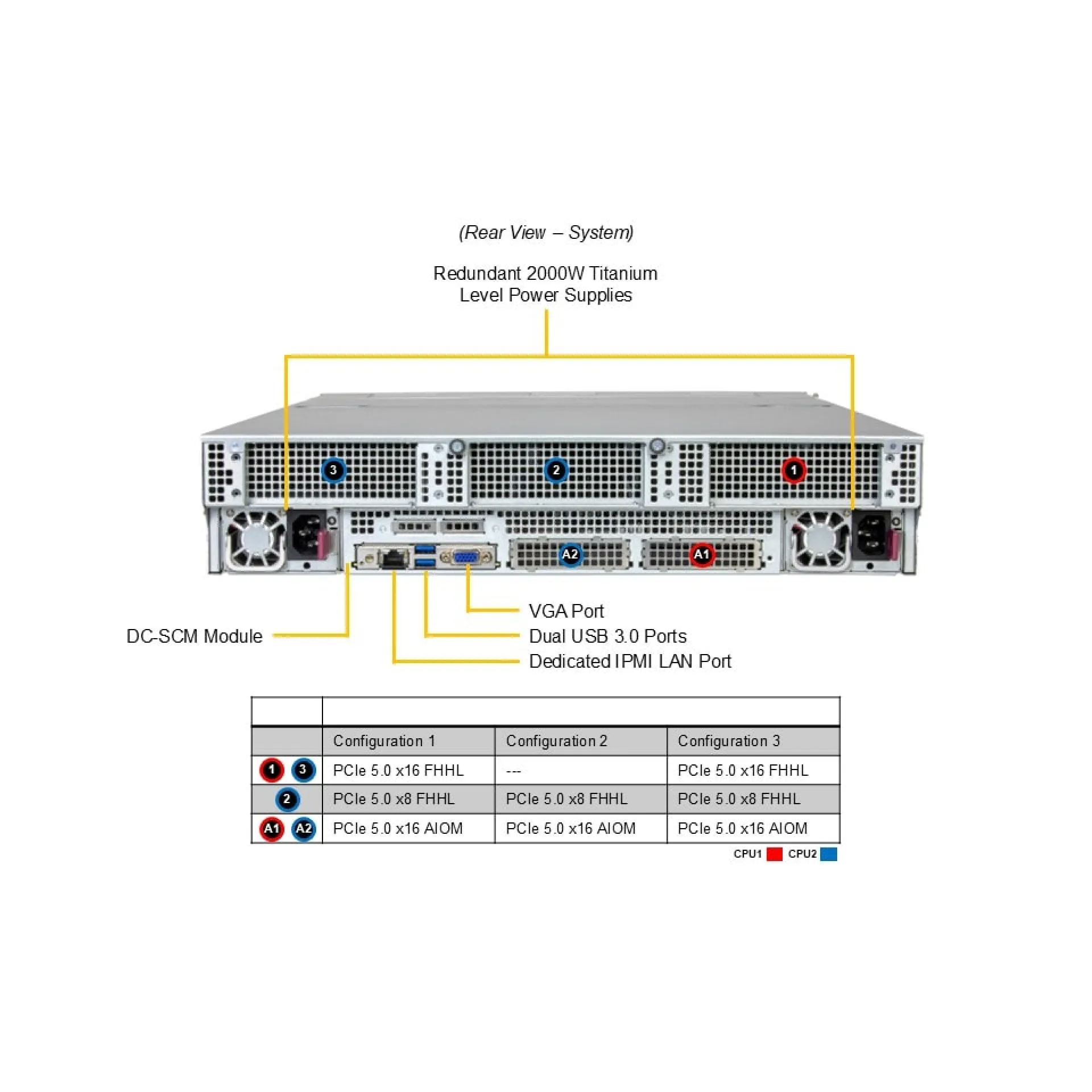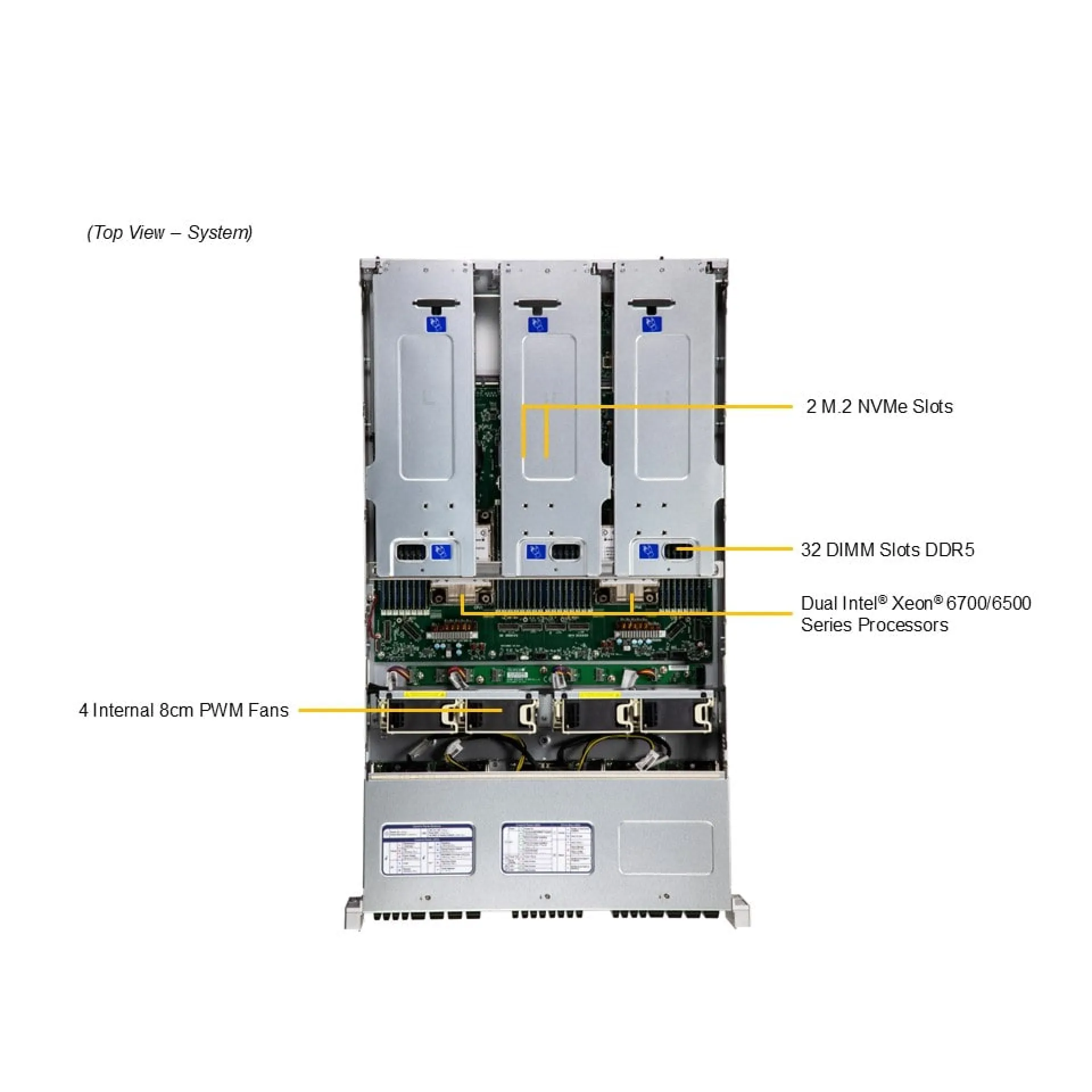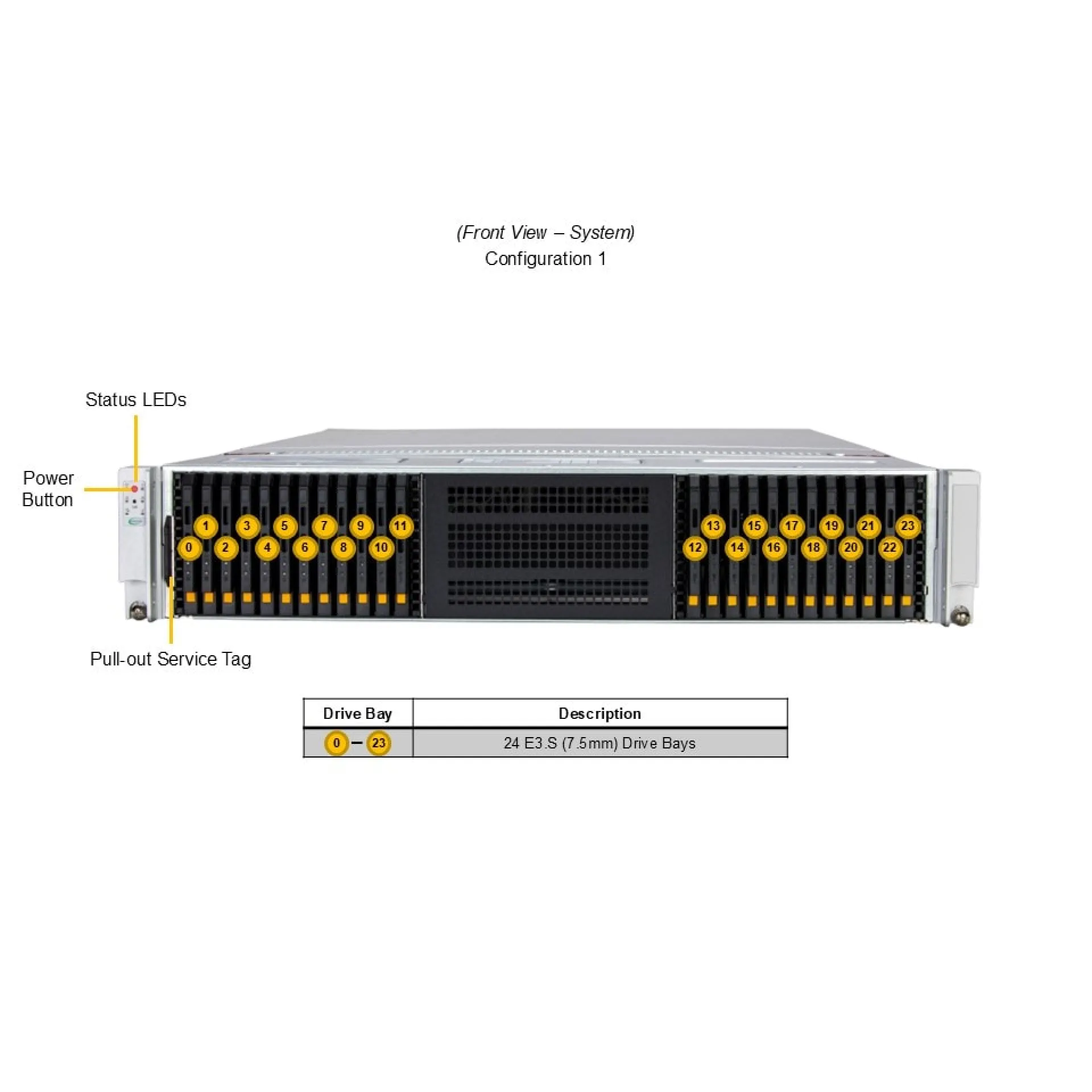 | Çift Intel Xeon 6700/6500 Serisi CPU P-Core/E-Core'larla, 24x E3.S sıcak değiştirilebilir sürücü yuvaları, 5x PCIe (3xFHFL, 2x AIOM OCP 3.0), 2x 2000W yedek güç kaynakları |