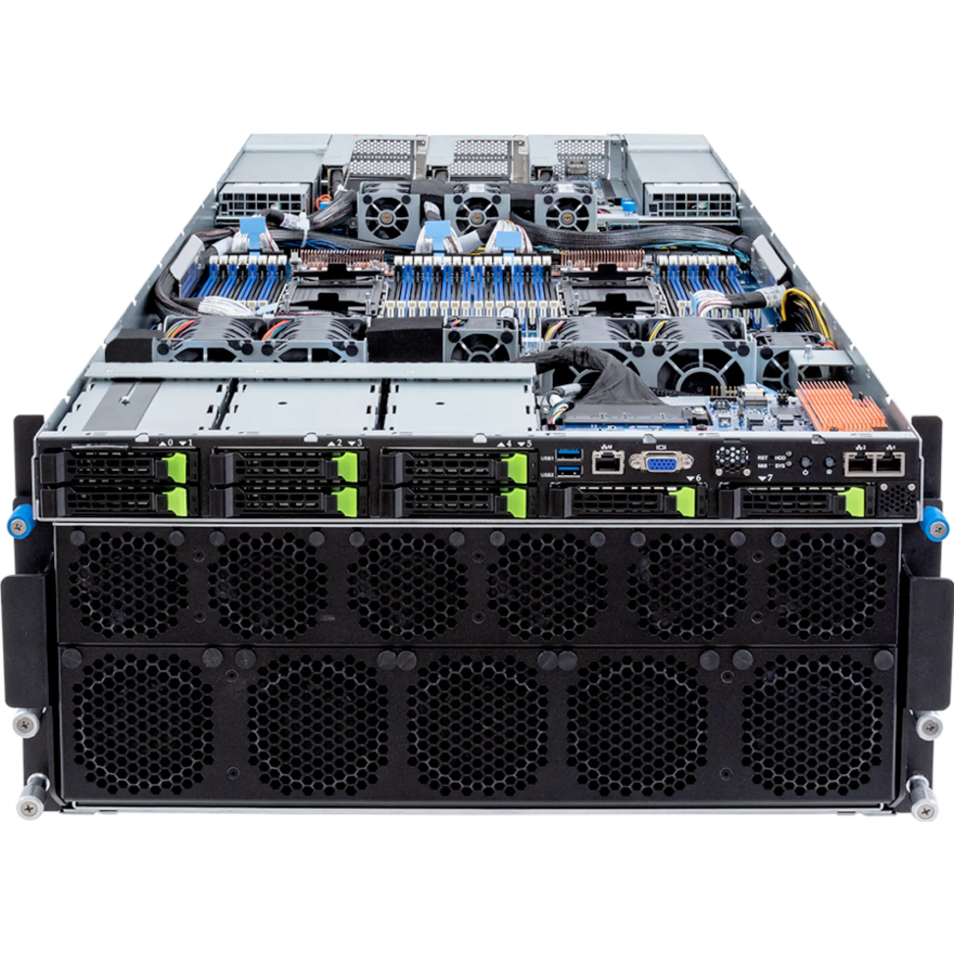 Bu sistem, AI merkezli iş akışları için hassas bir şekilde optimize edilmiştir, tek birleştirilmiş 4-root düzeninde NVLink™ üzerinden bağlı sekiz NVIDIA H100 Tensor Core GPU sunar. Dengeli bant genişliği tahsisi için tasarlanan platform, derin öğrenme, LLM eğitimi ve petabayt ölçekli çıkarım görevleri için GPU'lar ve CPU'lar arasında düşük gecikmeli iletişim sağlar. OCP 3.0 ağ desteği, geniş DDR5 bellek kapasitesi ve yüksek hızlı Gen5 NVMe aracılığıyla esnek depolama gibi ek özellikler, AI ve HPC'nin sınırlarını zorlayan modern işletmeler için iyi bir bilgisayar altyapısı oluşturur.