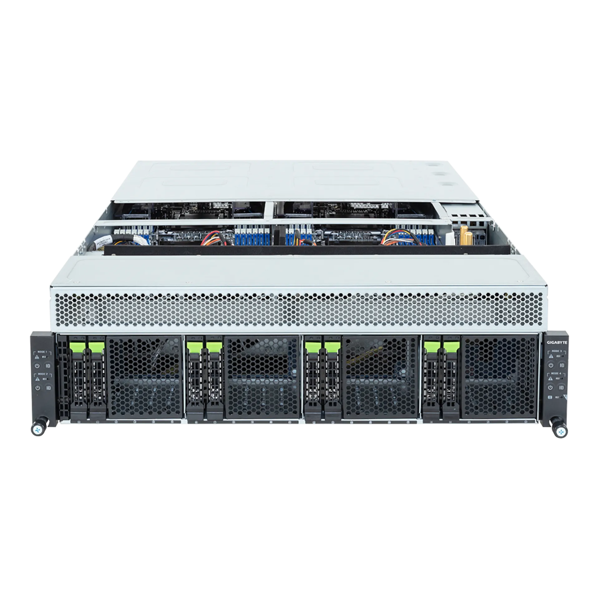 Gigabyte H374‑A81‑AAW1'e yatırım yapmak, kuruluşunuza eşsiz hesaplama gücü ve esneklik sunan bir sunucuyu donatmak anlamına gelir. Her düğümde, Gen5 NVMe, SATA ve SAS-4 destekleyen sekiz 2,5" sıcak değiştirilebilir sürücü yuvasının dahil edilmesi, kritik görev iş yükleri için hızlı veri erişimi ve yüksek verimlilik sağlar. 16 düşük profilli PCIe Gen5 x16 yuvası, GPU'lar, hızlandırıcılar veya ağ modülleri için geniş kapsamlı genişlemeler sunarak özel sistem optimizasyonuna olanak tanır. Üçlü 3000W 80 PLUS Titanium yedekli güç kaynakları, güç duyarlı dağıtımlarda bile sağlam operasyonel süreklilik sağlar.